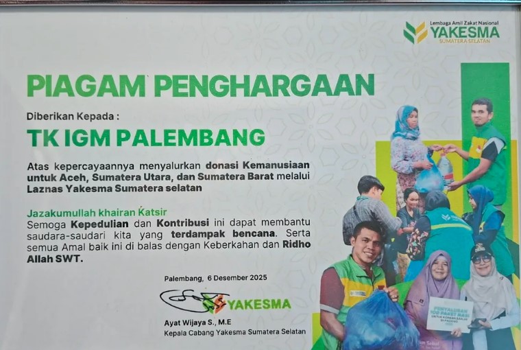Kepala TK IGM, Nazipah, S.Pd., menyampaikan bahwa donasi yang terkumpul telah disalurkan kepada Lembaga Amil Zakat Nasional (Laznas) Yakesma Sumatera Selatan. Penyerahan donasi ini merupakan tindak lanjut dari komitmen sekolah untuk menanamkan nilai-nilai kepedulian dan solidaritas sosial sejak usia dini. Melalui kegiatan ini, siswa diajak untuk merasakan empati terhadap sesama yang sedang mengalami musibah.